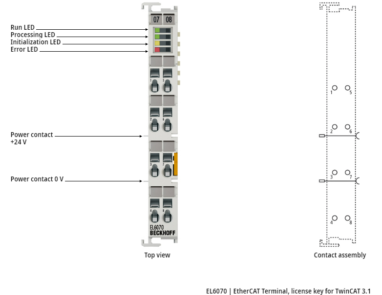 TwinCAT 3.1 ofrece una opción para gestionar las licencias de software TwinCAT a través del EtherCAT Terminal EL6070. El EL6070 incorpora la clave de licencia de hardware en el sistema de E/S EtherCAT modular.